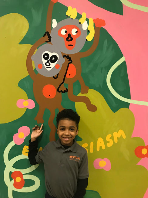 An ADORABLE art project done with the students of Kipp One. Twelve classrooms learned about twelve different jungle animals, and drew them in art class. The best/most unique drawings were chosen for me to paint into this big hallway mural for the students to see and be proud of every day! To share some extra cuteness, I've included pictures of the chosen drawings and of the students who drew them next to their animal.